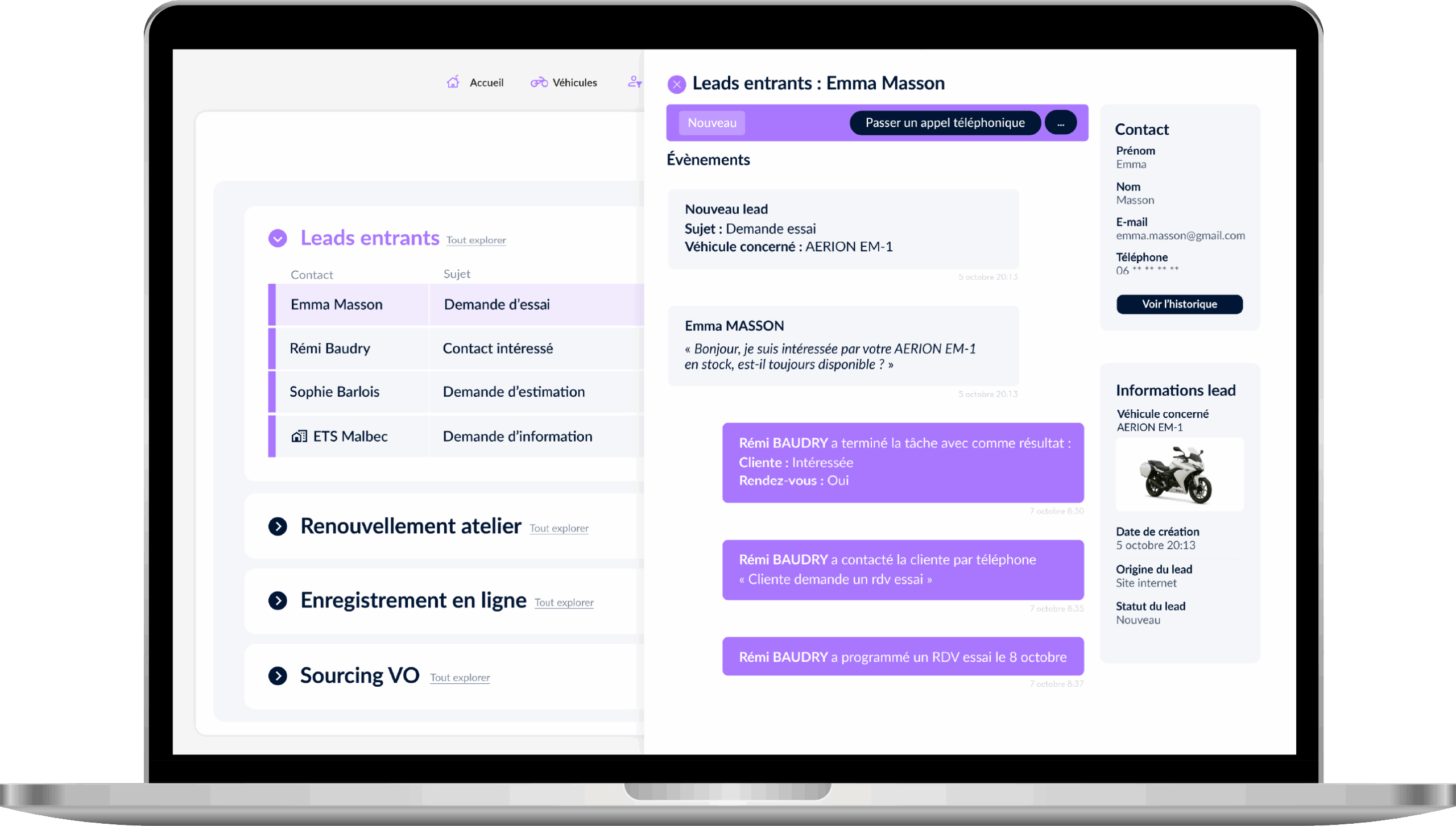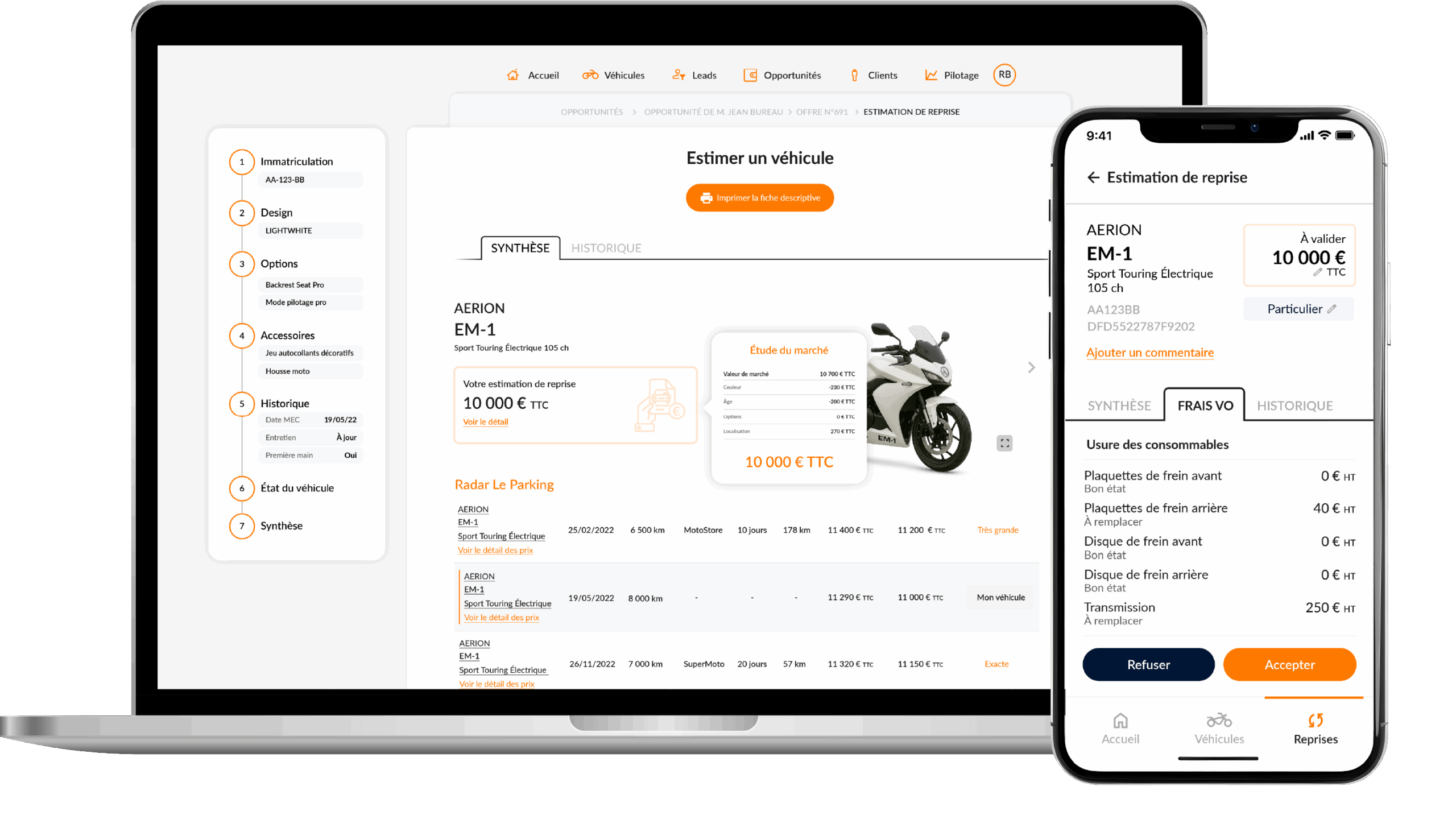 Couvrir toute votre chaine de valeur afin de piloter, à partir d’une plateforme unique, l’intégralité de votre activité de reprise : du traitement des leads jusqu’à la formalisation de l’offre de reprise de deux-roues.